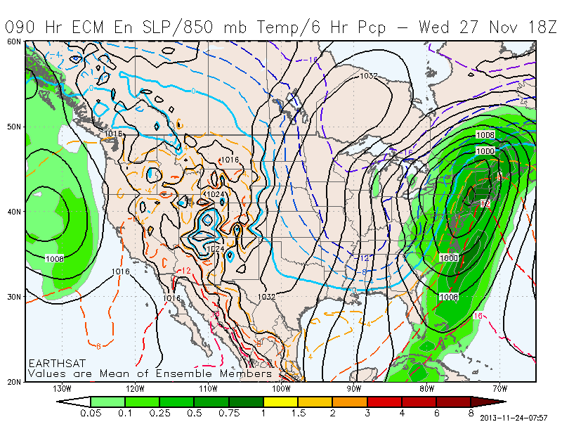 The bottom line is that the early morning commute could become a bit hazardous for some Tuesday morning. As we head into the later portion of the day, all areas will change to rain. Some of this may be heavy at times...with widespread 1-2" rainfall amounts. The second shot at wintry precipitation will be as the low passes us and colder air infiltrates the backside under counter clockwise northwesterly flow. I believe this will also be lake enhanced and mainly confined to the western slopes of mountains of West Virginia and western Maryland, but wouldn't be surprised to see a bit of this spill over into the Shenandoah Valley and northern piedmont during the afternoon and evening hours on Wednesday. Here's last nights 00z Euro ensembles depiction for Wednesday afternoon at 1pm.