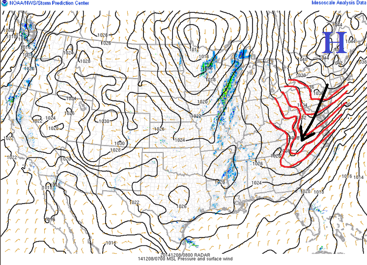 We have a strong area of high pressure (1044+ mb) building over New England. You can already see this extending down the eastern side of the Appalachians (1032 mb line down to the VA/NC border---pretty impressive)...yet another CAD (cold air damming) event that will lead to a light wintry mix event across the area.